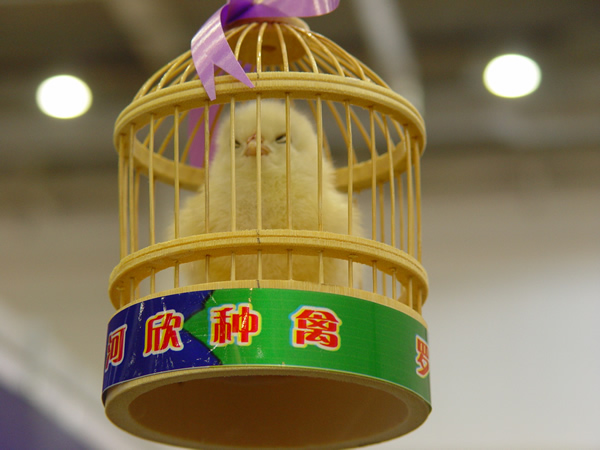 记者走进场馆,就被声声雏鸡的叫声所吸引。循声找去,原来是装在小笼中的可爱小鸡。这是河欣种禽公司所采取的独特展示方式。其挂在展位上的几十个小鸡笼不一会儿就被来访者索要一空,于是整个场馆就夹杂着声声稚嫩的叫声。