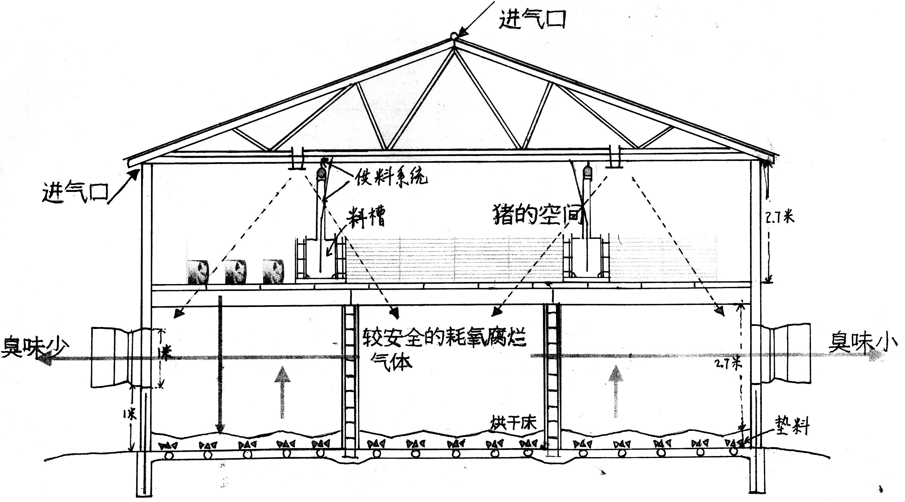 据美国专家介绍,这种猪圈为上下两层、尖顶,上层为育肥圈,下层为堆肥坑,层高均为2 .7米。一层地板为水泥结构(内铺通风管,数量视需要而定),距地面40~50厘米高,由水泥柱支撑。地板上铺45~50厘米厚的垫料(如干秸秆、废纸等),在前后墙上每隔一定距离设通风孔,通风孔直径1米,下沿距一层地板1米。另外,一层还设有粪肥烘干室。二层地板(猪床)为板条结构,猪的粪尿由板条间隙漏入堆肥坑。