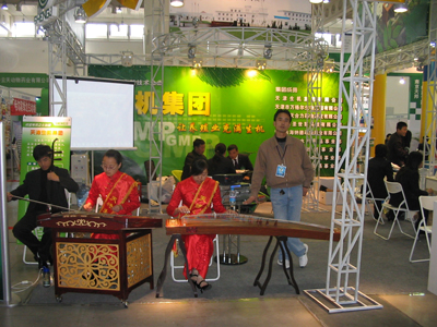 畜交会年年开,在展会上怎样把自己的企业宣传出去,让许多展商颇费心思,除了扩大展台规模,精心设计展台外,在这次畜交会上,天津生机集团的做法可真有点别出心裁。他们不但把二胡、古筝请进了自己的展位(图 3),而且企业负责人不时还和着音乐的节拍唱上几段,成了此次会展上的新鲜事儿。乐器和产品这本来不沾边的两件事,经过这么一策划,二胡、古筝焉然为客户与企业搭起了一座“鹊桥”。企业不但赚足人们的眼球,而且还给人留下了深刻的印象,很好地宣传了自己。