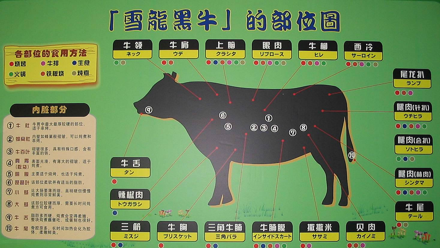 为了提高肉牛的养殖效益,大连雪龙集团除引进日本和牛冻精改良当地肉牛,进行科学饲养外,还跟日本合资成立了大连兼松雪龙食品有限公司,他们的牛就采用了日本和牛的分级方法:在牛胴体价值的基础上,通过把食用价值和品质相同的肉块(单独或一并)分割出来,低温排酸,并对每种牛肉评定不同等级,再经过精细处理销售,并将研制的针对不同部位牛肉的食用方法出示给消费者,从而提高了分割肉块的档次和价值(见图)。分割出的西冷、牛柳、眼肉为牛身上品质最好的肉块,售价每公斤在800元左右,而牛领、会扒等部位也不便宜,整体算来,一头牛的效益提高了好几倍。
