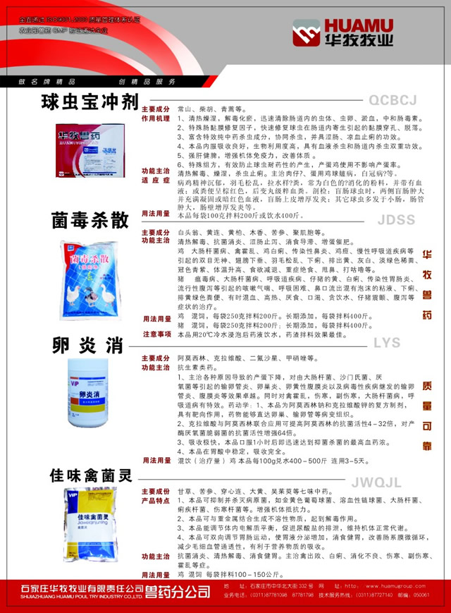 石家庄华牧牧业有限责任公司前身为石家庄华牧集团公司,创立于1984年,现有员工880人,公司下设种禽分公司、兽药分公司、饲料分公司、有机肥厂、禽蛋事业部、禽病防治中心等单位,总资产1.3亿元,实际使用资产3亿元,年销售收入1.95亿元,华牧牧业有限责任公司为中国家禽业协会副会长单位,华牧牌商标被认定为河北省著名商标,公司整体通过ISO9001质量管理体系认证。