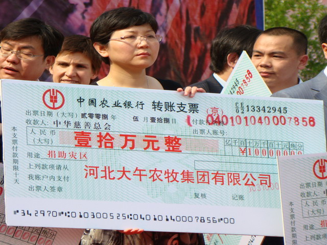 河北大午农牧集团种禽有限公司“中国畜牧、饲料行业抗震救灾募捐仪式”为地震灾区捐款10万元