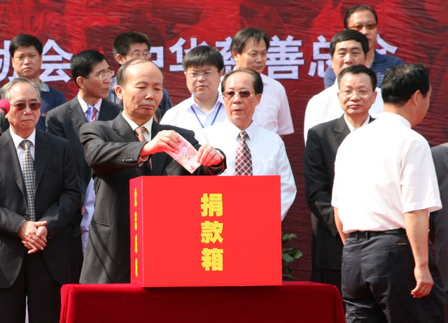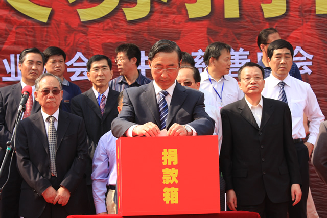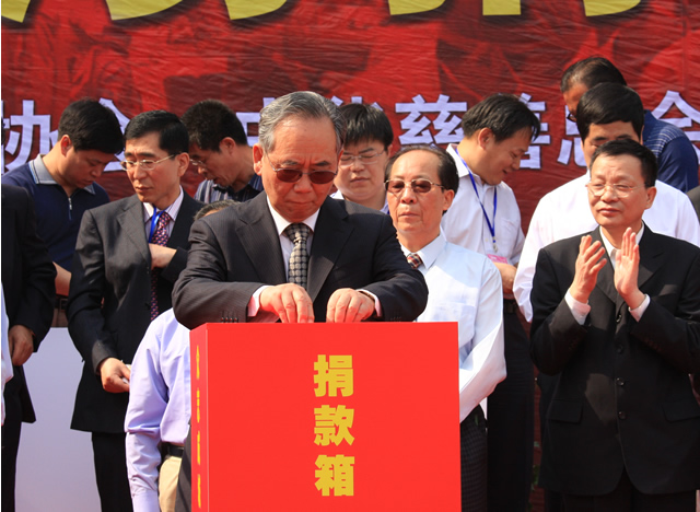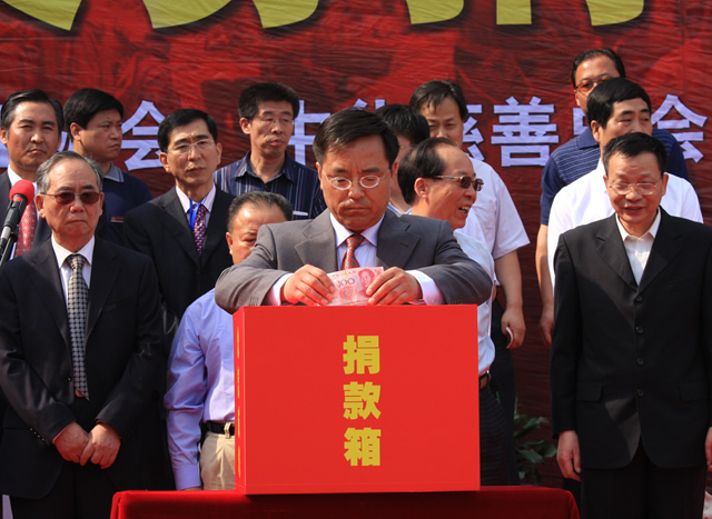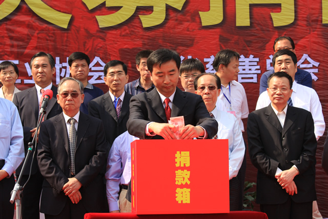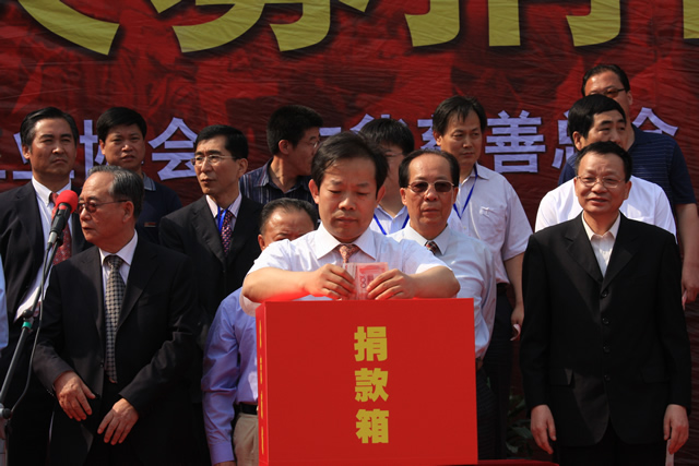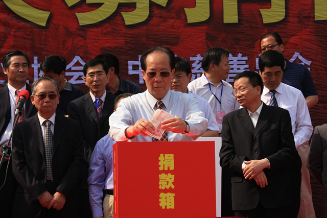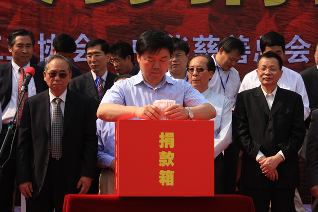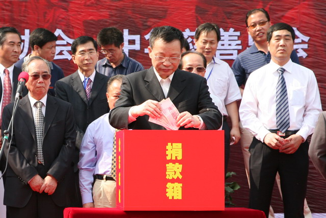 农业部原副部长、中国奶业协会理事长刘成果在中国畜牧饲料行业抗震救灾募捐仪式上捐款