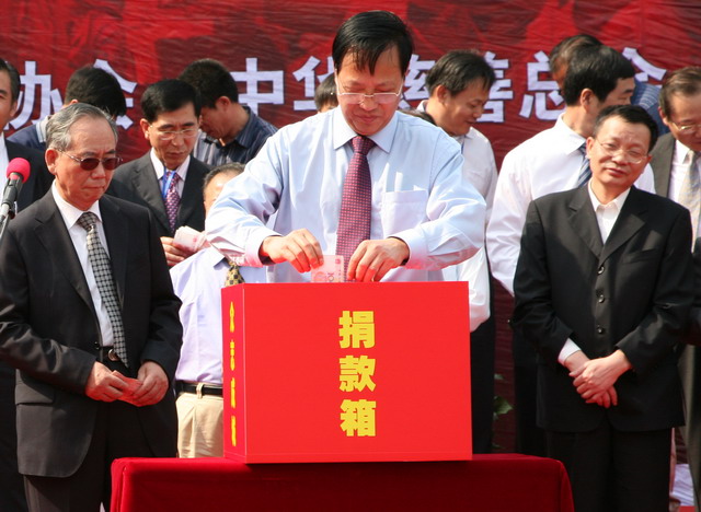 卫生部原副部长、中华慈善总会副会长彭玉在中国畜牧饲料行业抗震救灾募捐仪式上捐款