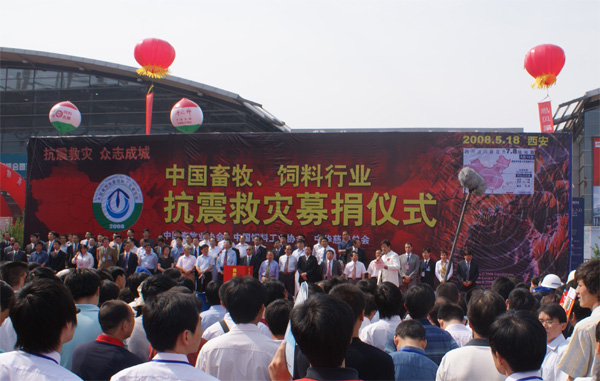 为了支援四川省汶川县等灾区的抗震救灾工作,我们号召会员企业、个人积极向灾区人民伸出援助之手,各尽所能,自愿捐款捐物,为灾区人民恢复生产,重建家园,尽微薄之力。在募捐仪式上,现场设立了爱心捐款箱,接受畜牧饲料行业募捐者的爱心捐款。与会的有关领导、国内外畜牧饲料行业官员及参展商纷纷捐款,现场共募集救灾资金近 700 万元,这些慈善捐款全部汇入中华慈善总会指定账户,同时,对畜牧饲料行业企业家、个人及相关人士后续捐赠的现金与实物,将提交中华慈善总会,统一协调给地震灾区。