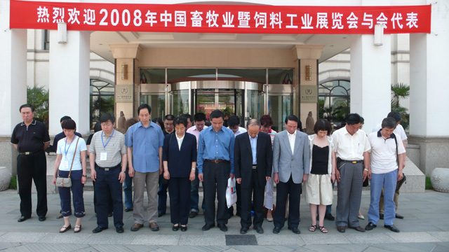 2008年5月19日14点28分,参加2008中国畜牧业暨饲料工业展览会的部分与会代表为四川汶川地震死难同胞默哀。