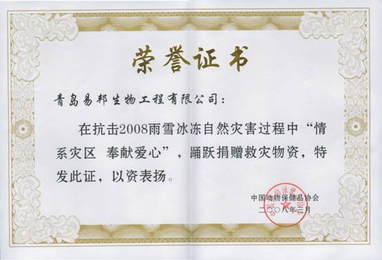 2008年春节前后,我国南方部分省份发生了罕见的低温雨雪冰冻灾害,造成大量畜禽因灾死亡,畜牧业生产受到了很大的影响。在此紧急关头,为支持灾区恢复生产,响应中国动物保健品协会组织发起的“情系灾区、奉献爱心”捐赠活动,我公司在春节期间组织紧急生产,为灾区捐赠了大批疫苗和消毒药品,为防止灾后重大动物疫病的发生流行,发挥了积极作用。