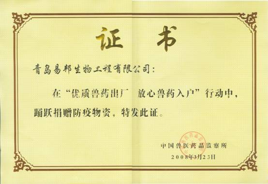 2008年3月23日,在中国兽医药品监察所主办、中国动物保健品协会承办的“优质兽药出厂、放心兽药入户”行动启动仪式上,我公司行政总监杨晓梅代表公司从国家首席兽医师贾幼陵手中接过了“情系灾区、奉献爱心”和“优质兽药出厂、放心兽药入户”两个物资捐赠荣誉证书。做为国内兽用生物制品行业的中坚力量,易邦公司在此次启动仪式上,我们与国内32家兽用生物制品和兽药生产厂家联合发出兽药质量宣言,自觉接受社会监督,坚持创优质品牌,做一流优质产品。