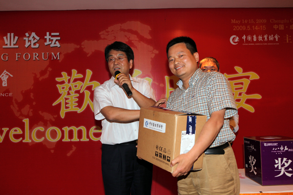 一等奖笔记本电脑(1名)获得者接受中国畜牧业协会副会长乔玉锋颁奖。