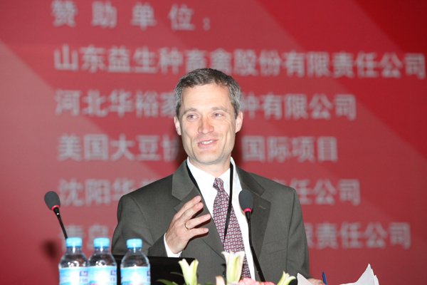 美国海兰国际公司国际销售部经理汤姆.迪克森在蛋鸡大会上做题为《美国鸡蛋市场趋势》的报告。