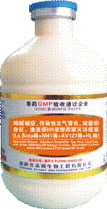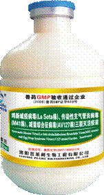 【兽药名称】 鸡新城疫病毒(La sota株)、传染性支气管炎病毒 (M41株)、减蛋综合征病毒(AV127株)三联灭活疫苗 【产品特点】 (1)免疫保护期长:全套引进美国MILLIPORE膜分离浓缩技术,抗原超强浓缩,抗体高,维持时间长,免疫保护长达5个月以上。 (2)疫苗副反应小:法国进口佐剂,免疫增强作用好;粘度小,注射方便;易吸收,残留小,应激小;抗原纯化,除去杂蛋白、尿酸盐等杂质,疫苗副反应小。 (3)国际标准毒株——AV127株,免疫原性好,确保产蛋不下降。 (4)中国第一家将传染性支气管炎效价提升至国际标准,品质更可靠。