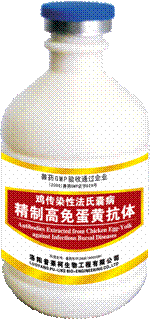 【兽药名称】通用名:鸡传染性法氏囊病精制高免蛋黄抗体 【作用用途】用于鸡传染性法氏囊病早、中期感染的紧急治疗和紧急预防。 【用法用量】皮下或肌肉注射,用前摇匀。治疗用量:小鸡0.5ml,大鸡1ml。必要时可以重复注射2~3次。预防量减半。 【规 格】100ml/瓶、250ml/瓶、500ml/瓶