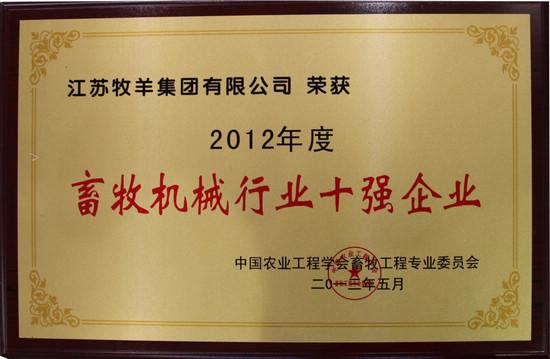牧羊集团凭借2012年度的卓越表现和对行业做出的贡献,荣获“2012年度畜牧机械行业十强企业”称号。