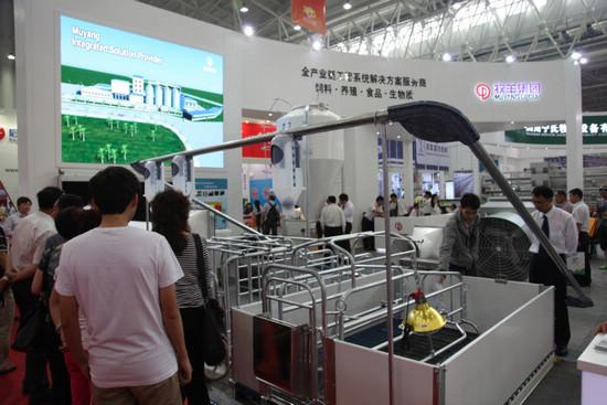 展会上,牧羊集团首次展出的养殖设备吸引众多参观者。展出的养殖设备中,养猪场环控系统由风机、水帘卷帘、环控仪,控制养猪场的温度、湿度、二氧化碳及氨气等有害气体的浓度,保证猪只有合适的生活环境;喂料系统采用链式(或绞龙)料线,能够实现全自动定量定时喂料,有效降低人工劳动强度,节约人力资本,便于猪场管理;栏位系统全部采用拼装结构,无焊接安装,具有多处人性化的设计,方便了猪场饲养员的操作。