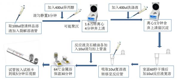 以下是该产品的简单操作流程,给大家展示了国内最简练的基因恒温扩增检测方法,这样简单的操作即使中学文化的人员都能顺利地完成。