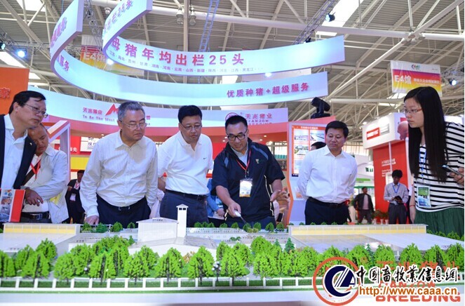 在5月19日专业参观日上午,正大集团农牧食品企业中国区资深副董事长白宇飞、正大集团资深执行副总裁谢毅、青岛正大资深总裁李瑞寒等一行来到天兆猪业展位猪场模型区,天兆猪业董事长余平先生为其讲解“余式布局”模型并一同观看了猪场建设3D动画视频,随后,国家农业部副部长于康震、全国畜牧总站站长李希荣等一行莅临天兆展位,并来到天兆猪场模型前参观天兆猪场模型,天兆猪业董事长余平先生向于部长介绍了天兆猪业通过近几年的摸索后寻找到的修建猪舍最好的方式——余式布局,及其同时满足四大需要(猪的需要、管理的需要、环保的需要、猪场员工的需要)的特点,于部长听后对此赞赏有加。