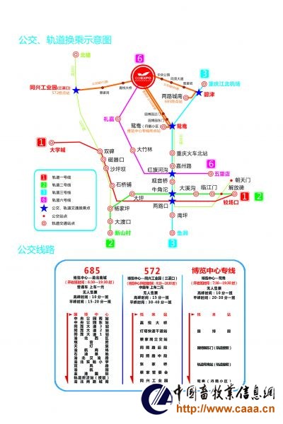 乘轨道交通2号线至【牛角沱站】换乘轨道交通3号线至【红旗河沟站】换乘6号线至轨道国博站或轨道悦来站下至展会现场,