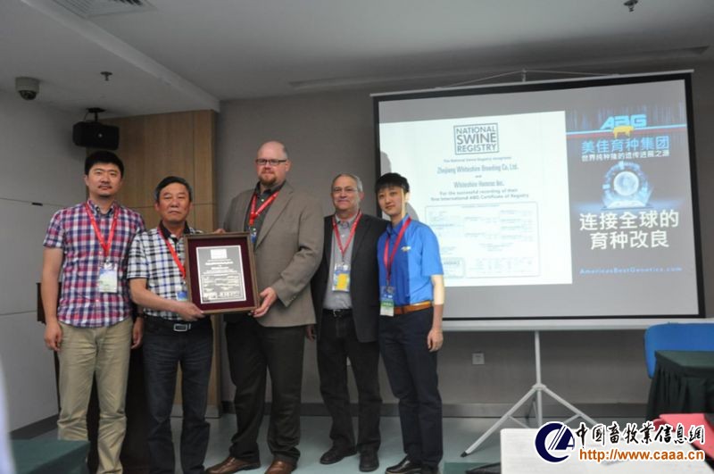 5月19日上午,在沈阳举办的2016中国畜牧业博览会上,美国国家种猪登记协会(National Swine Registry, NSR)和美佳育种集团(America’s Best Genetics, ABG),举办了第二届海外成员单位授牌仪式。NSR的全球技术服务副总裁道格拉斯.纽康博士,为两家新晋的中国成员单位,颁发了NSR/ABG种猪登记的牌匾。这两家企业分别是浙江沃德威先种猪有限公司及美国合作伙伴美国华特希尔育种集团,广东德兴种养实业有限公司和他们的美国合作伙伴美国谢福种猪基因公司,代表着这两家中国单位正式成为NSR/ABG的会员。