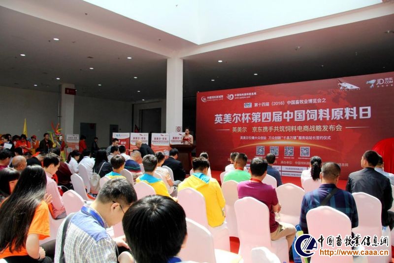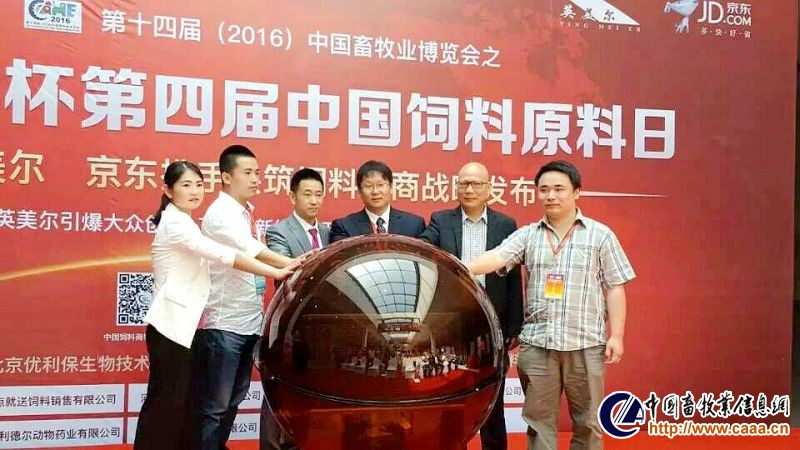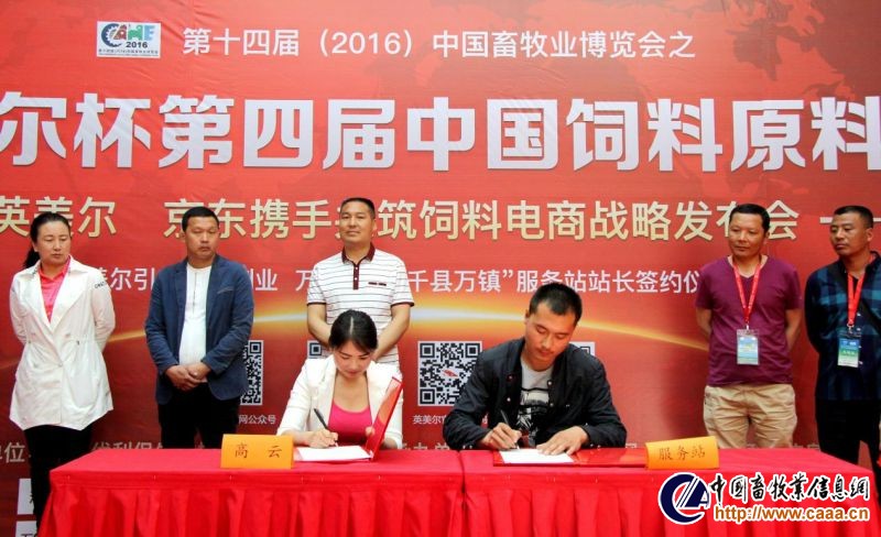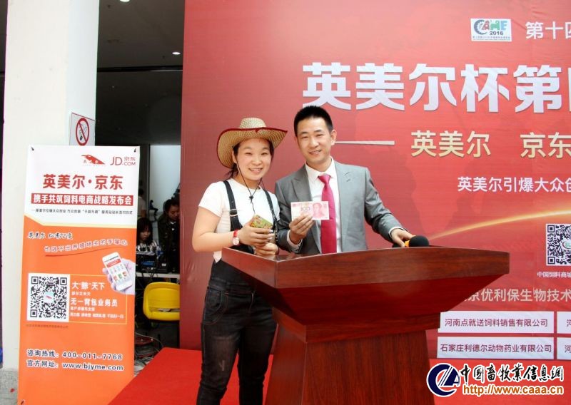 2016年5月18日-20日于沈阳国际展览中心举办的第十四届中国畜牧业博览会中,英美尔高调冠名第四届中国饲料原料日。英美尔在展会期间不仅成功举办了“英美尔•京东携手共筑饲料电商战略发布会——英美尔引爆大众创业、万众创新‘千县万镇’服务站站长签约仪式”,出席活动现场的嘉宾有中国畜牧业协会副秘书长刘强德、京东集团农业电商部项目经理单鹤祥、京东集团农业电商部产品经理张云龙、英美尔品牌创始人方加银、英美尔全国服务站负责人高云、英美尔市场总监李宏等,在中国畜牧业博览会现场媒体及近万名观众的见证下共同开启‘千县万镇’服务站站长签约仪式。现场更有“20万奖金现场派送”活动,吸引了很多现场人员的热情参与。前来扫码抽奖的观众争先恐后络绎不绝,现场氛围异常火爆。在活动的带动下,英美尔品牌瞬间成为畜博会耀眼的明星,受到了同行业及近百家媒体的广泛关注。