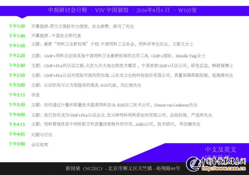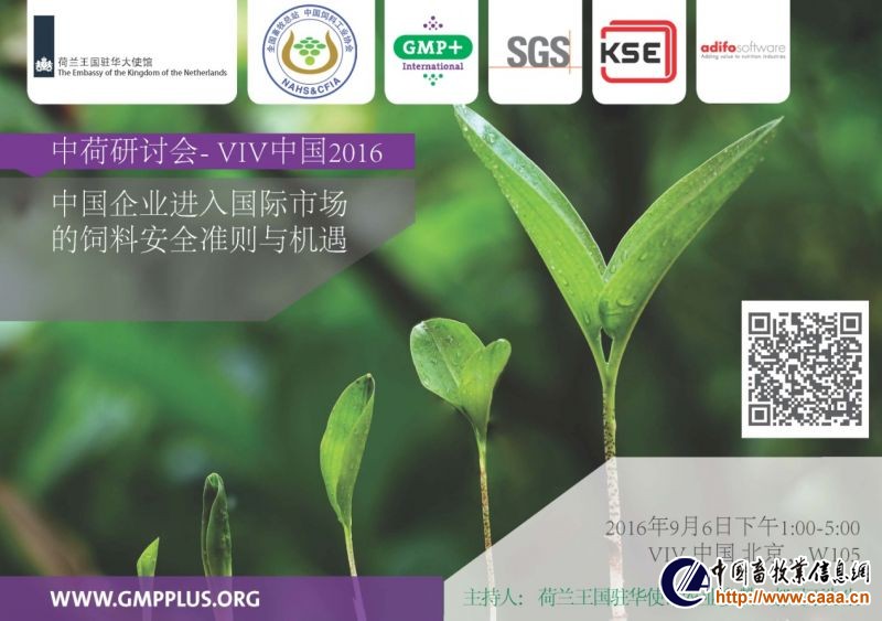 由荷兰王国驻华大使馆(The Embassy of the Kingdom of the Netherlands)、中国农业部、中国饲料工业协会、GMP+ International联合举办的中荷研讨会,将于2016年9与6日下午1:00-5:00在北京新国展(VIV 中国)W105室召开。