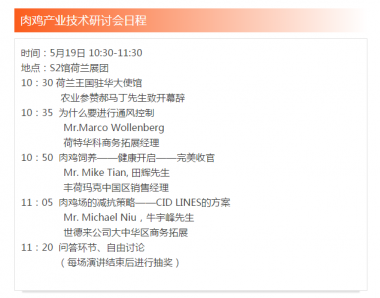 荷兰农业协会(NAFTC)以国家展团的形式参加“第十七届中国畜牧业博览会(CAHE)”,于5月19日在S2馆荷兰展团举办荷兰肉鸡和蛋鸡产业技术研讨会。