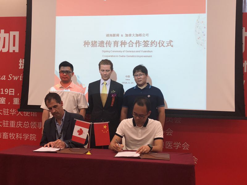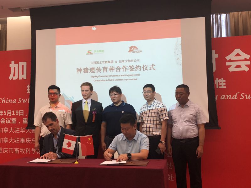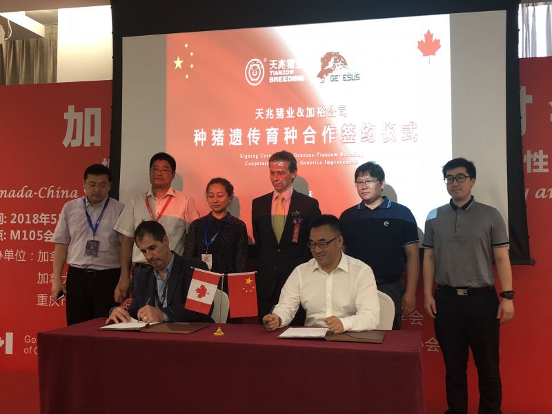 会议期间,天兆猪业、山西凯永农牧集团、湖南源舜分别与加拿大加裕公司举行种猪遗传育种合作签约仪式。