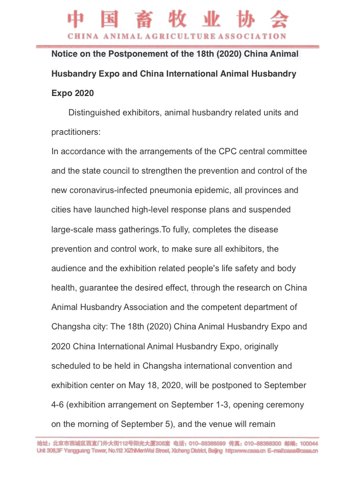 第十八届(2020)中国畜牧业博览会延期至9月4日