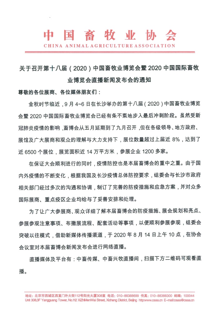 关于召开第十八届(2020)中国畜牧业博览会暨2020中国国际畜牧业博览会直播新闻发布会通知