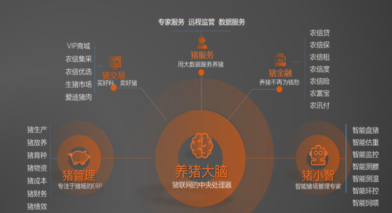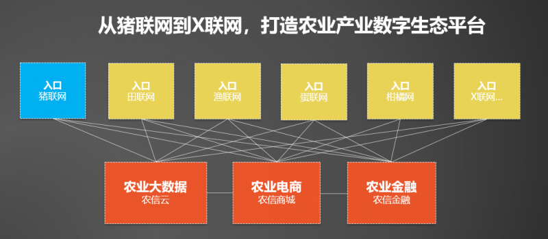 在成功打造核心业务“猪联网”的基础上,农信互联持续发力涉农产业,将产业互联网的触角不断延伸到涉农各产业。如今,农信互联已组建了近800人的“农业+互联网+金融”交叉专业人才团队,业务遍布全国数十万涉农产业上下游企业,涉及数百万涉农人群,农信商城提供产业闭环交易服务,农信金服为农业产业链上下游用户提供贷款、保险、融资租赁、保理、理财、结算支付等金融服务。