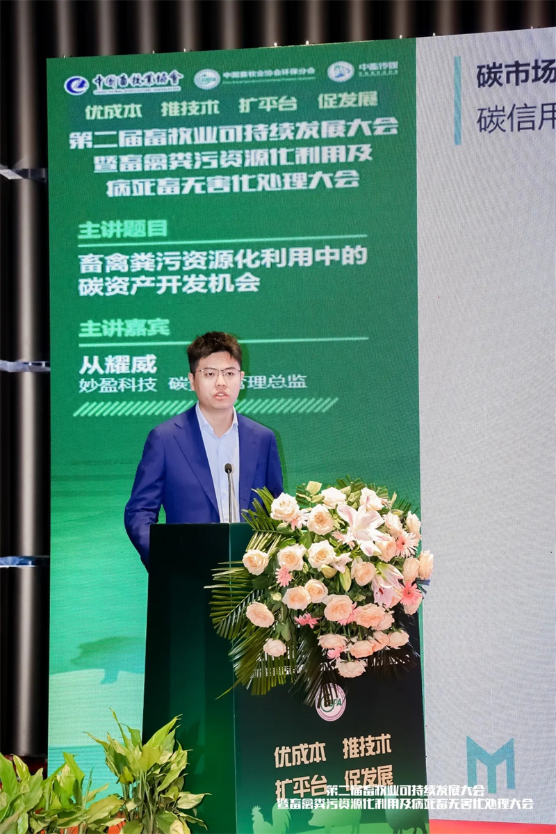 从耀威总监现场分享了《畜禽粪污资源化利用中的碳资产开发机会》的报告。报告中向大家分享碳交易市场现状、面临的挑战及机遇、畜禽粪污资源化利用的减排原理、自愿减排项目开发流程分享、典型项目的减排量分析等内容。